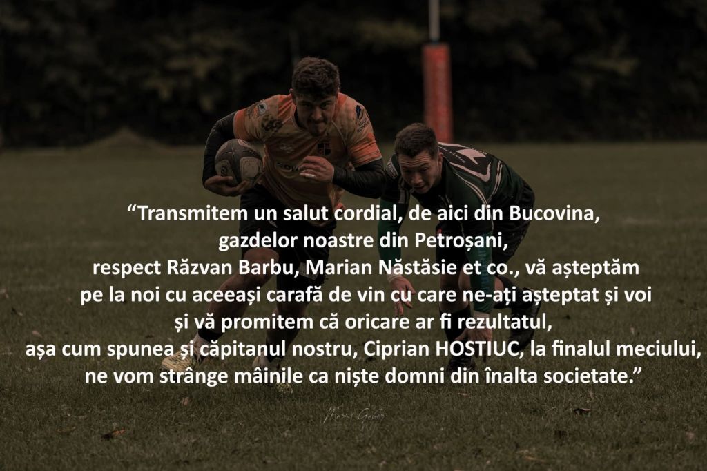 Transmitem un salut cordial, de aici din Bucovina, gazdelor noastre din Petroșani, respect Răzvan Barbu, Marian Năstăsie et co., vă așteptăm pe la noi cu aceeași carafă de vin cu care ne-ați așteptat și voi și vă promitem că oricare ar fi rezultatul, așa cum spunea și căpitanul nostru, Ciprian HOSTIUC la finalul meciului, ne vom strânge mâinile ca niște domni din înalta societate. Aia a rugby-ului, că aia a pinguinilor pe care o pomeneam la început e pentru alții, mai puțin stilați, dacă înțelegeți ce vreau să spun. Dacă nu, nu-i bai, vă scriu eu în privat, că dacă o spun aici, se activează și ne paște plictiseala.